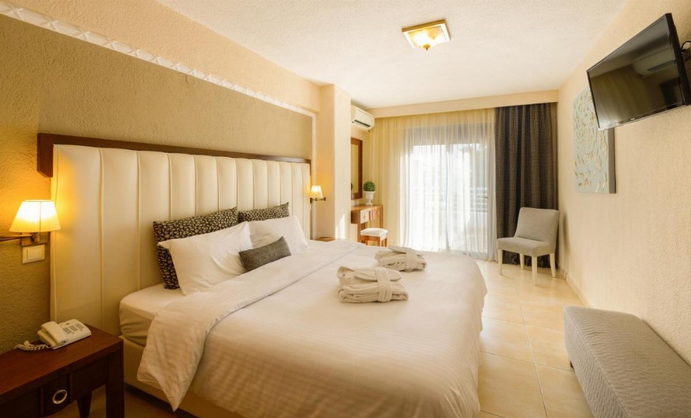 Includes a Plasma TV, telephone, mini bar, bathrobes and a furnished terrace with views to the sea and to Mount Olympos.